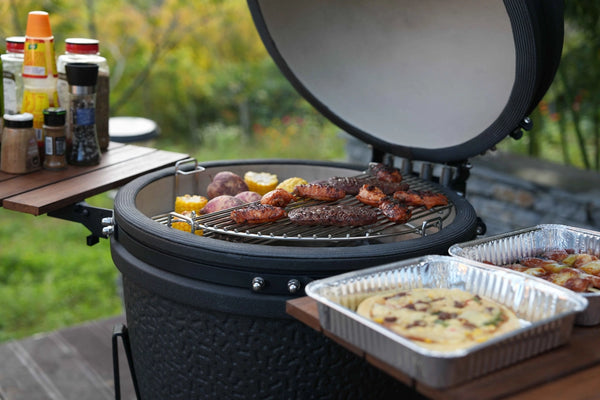 - Charcoal basket with divider for flexible heating zones and easy charcoal removal